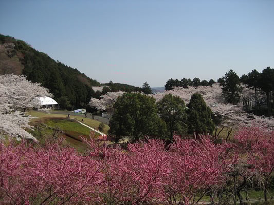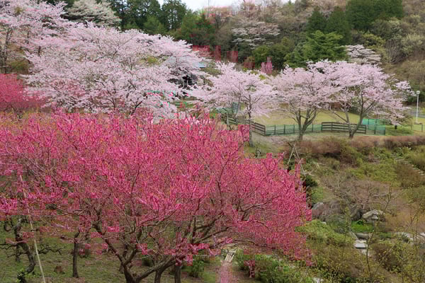 園内に矢口やホーキモモなどの花桃が植えられています。桜の咲く少し前に咲き、奥山高原は春の華やかな雰囲気に包まれます。 またはなももの木の下にはニホンサクラソウを植栽し、4月中旬には可憐に咲きそろいます。
